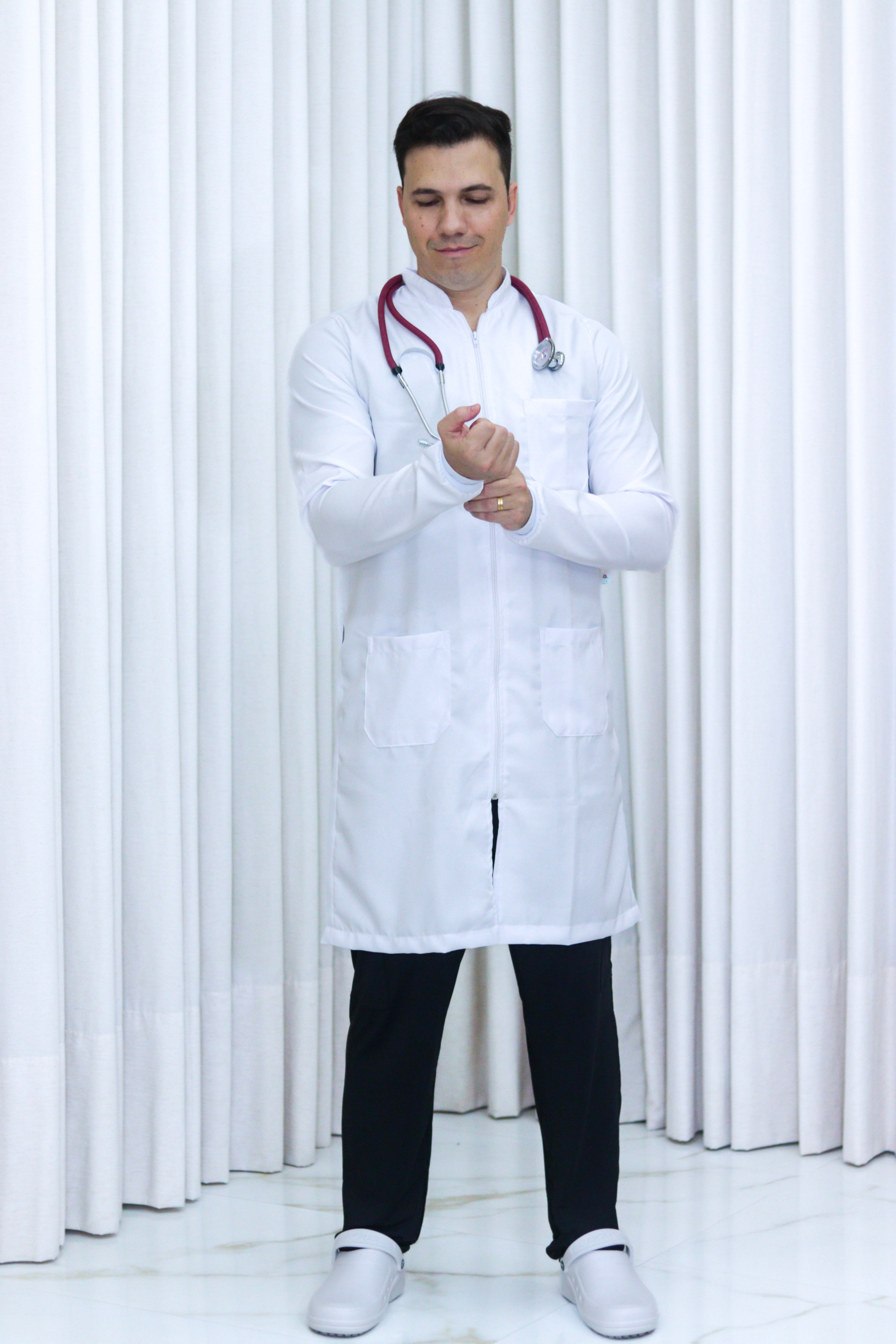 Jaleco com gola padre e fechamento frontal em zíper, desenvolvido para oferecer praticidade e um visual moderno. O modelo conta com punhos com elástico, que garantem melhor ajuste e segurança durante o uso, proporcionando conforto e liberdade de movimentos.
